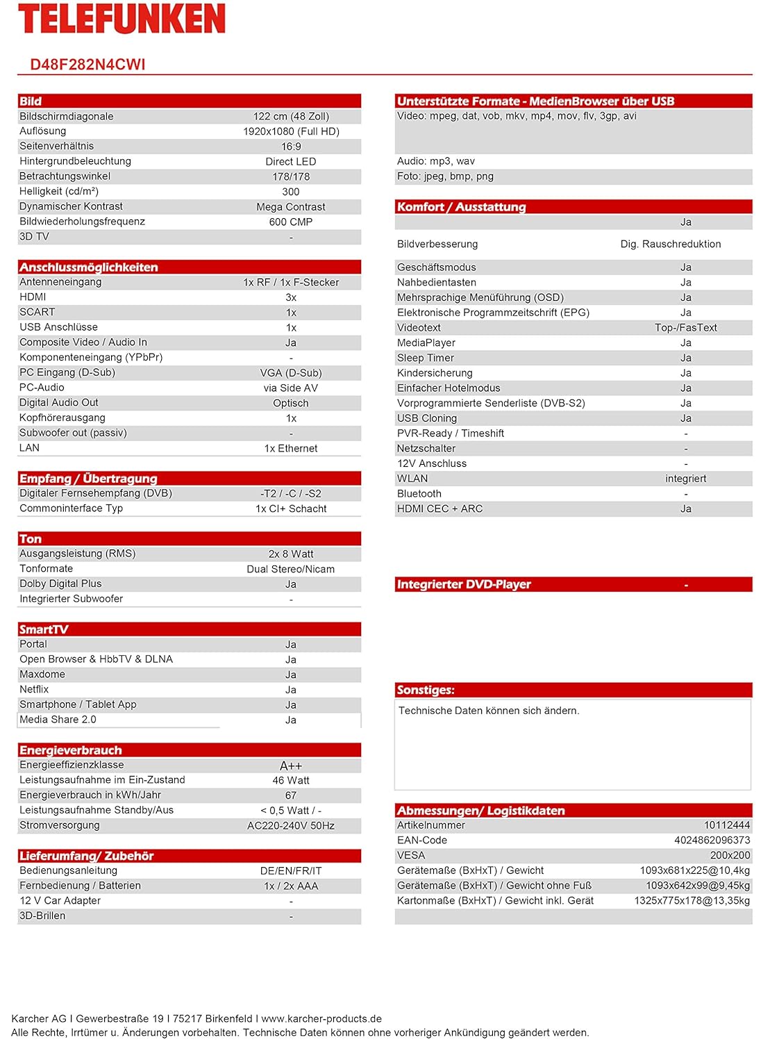 Telefunken D48f282n4cwi 122 Cm 48 Zoll Fernseher Full Hd Triple T